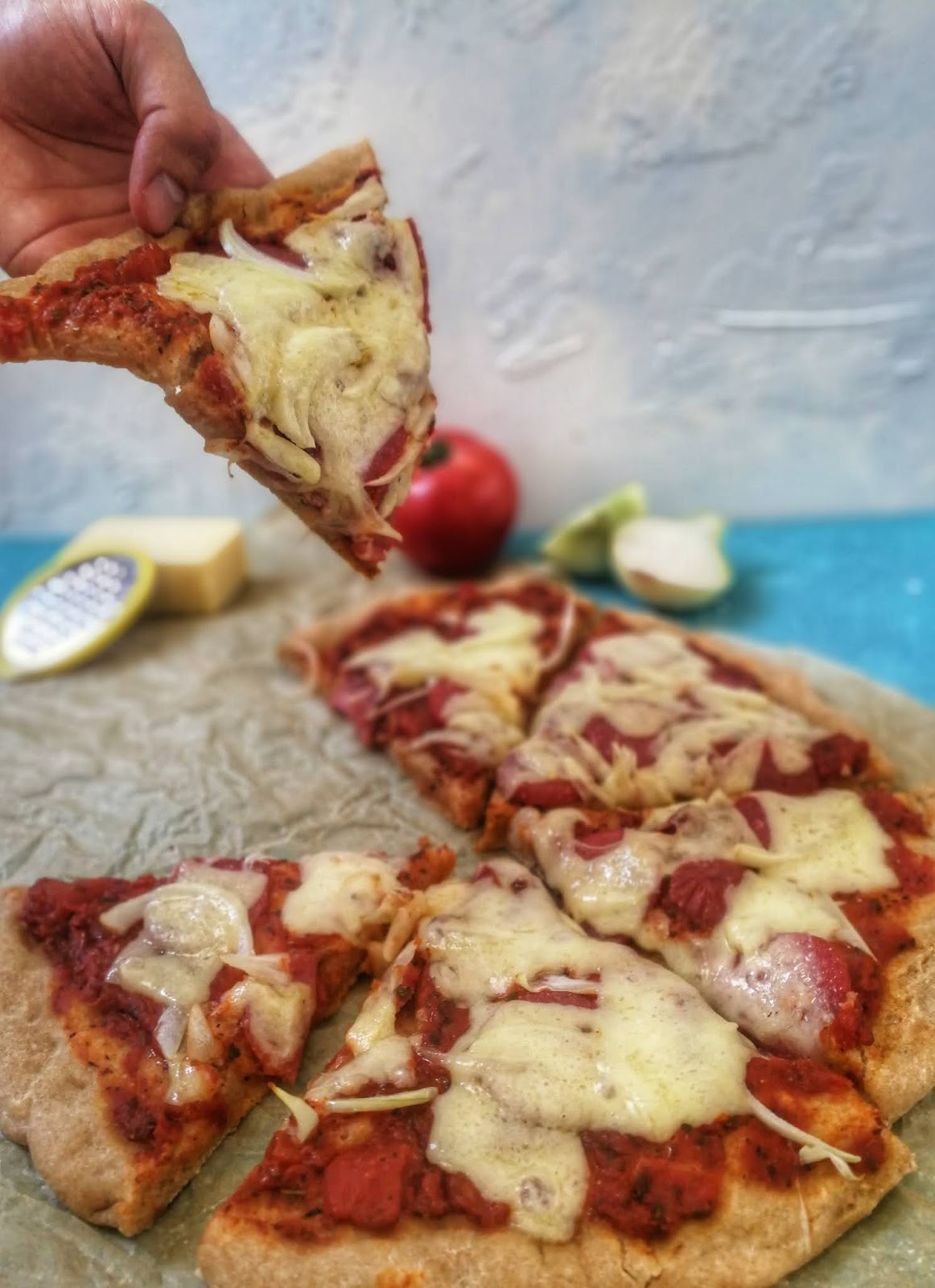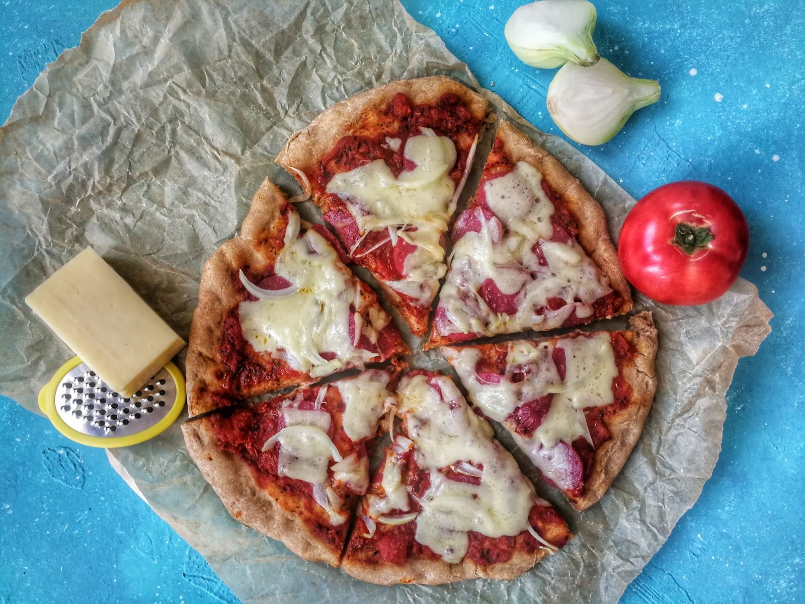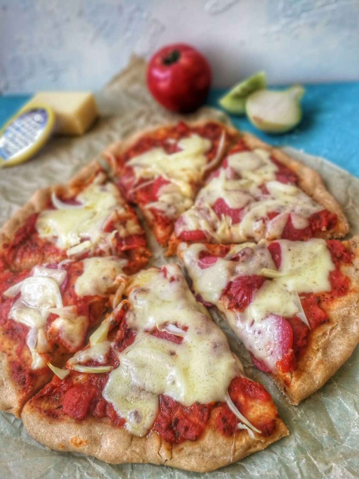 Rekomendowane dodatki: Sos pomidorowy (najlepiej zrobić samodzielnie z pomidorów z puszki, cebuli, czosnku i przypraw. Zajmuje to dosłownie 5 minut i możesz zrobić to w czasie, gdy ciasto rośnie), ser mozarella, ser żółty, tofu/szynka z dobrym składem, papryka, pomidory,suszone pomidory, rukola (pro tip. Rukolę dodajemy na ostatnią minutę pieczenia pizzy)