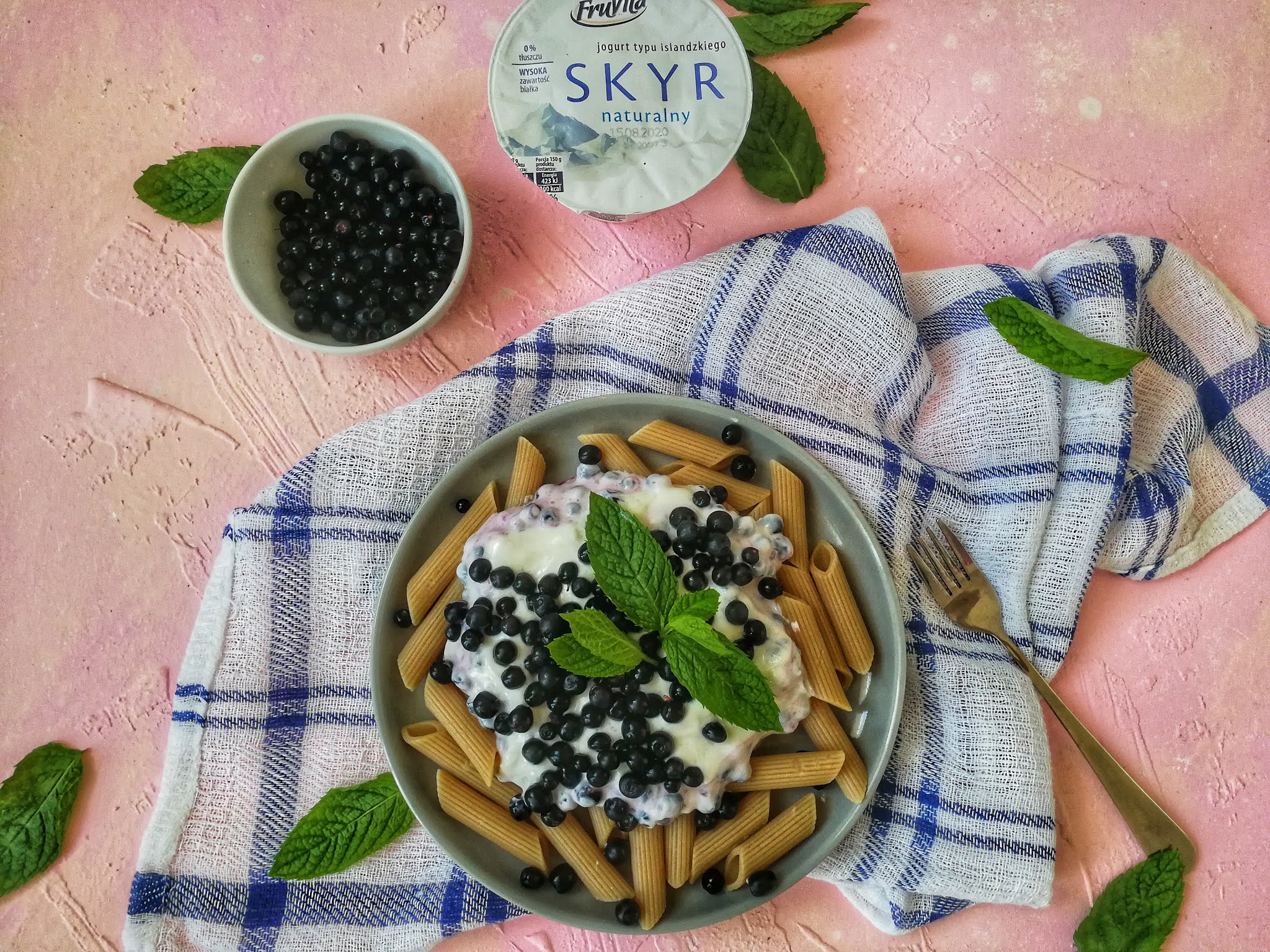 Tradycyjnie zawsze jadło się białą kluchę z tłustą słodką śmietaną, jagodami a jeszcze do tego posypywało się cukrem. Teraz jednak realia się zmieniły, dieta z niskim IG jest już częścią mojego życia. Makaron jest pełnoziarnisty, zamiast śmietany dałam skyr, nie słodziłam dodatkowo, bo po co? Jagód możesz dodać tyle, ile chcesz.